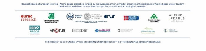 BeyondSnow è un progetto Interreg - Alpine Space co-finanziato dall’Unione Europea. Il suo obiettivo è di ridurre la dipendenza dalla neve delle località turistiche invernali nella regione alpina, rafforzando la resilienza al cambiamento climatico, promuovendo la capacità di conservare/aumentare la reddittività dei residenti e l’attrattività per i turisti.